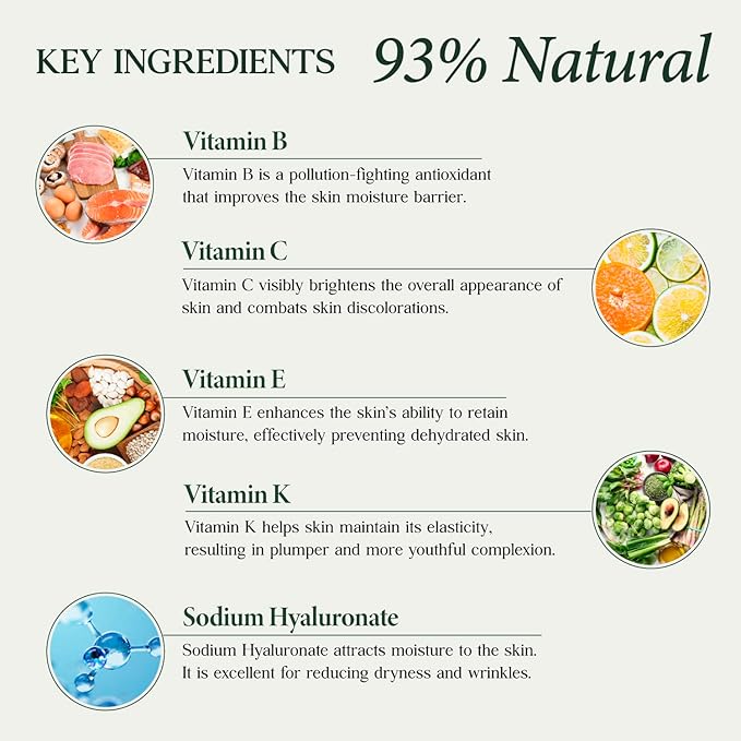 - -[COMPLETE NUTRITION FOR SKIN CELLS] This multi-vitamin serum contains antioxidants + Vitamin B, C, E, and K. Vitamin B is a pollution-fighting antioxidant that improves the skin moisture barrier. Vitamin C visibly brightens the overall appearance of skin and combats skin discolorations. Vitamin E enhances the skin’s ability to retain moisture, effectively preventing dehydrated skin. Vitamin K helps skin maintain its elasticity, resulting in plumper and more youthful complexion.