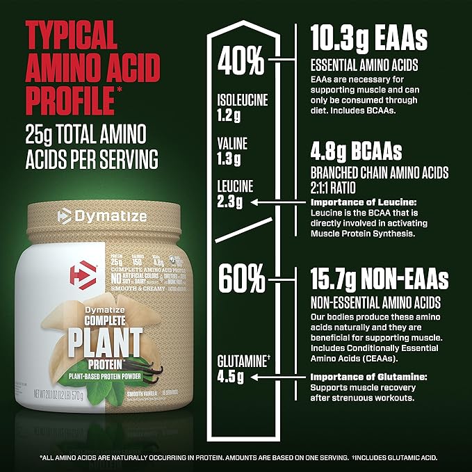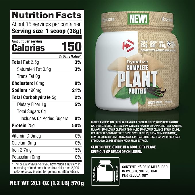 Dymatize Vegan Plant Protein, Smooth Vanilla, 25g Protein, 4.8g BCAAs, Complete Amino Acid Profile, 15 Servings