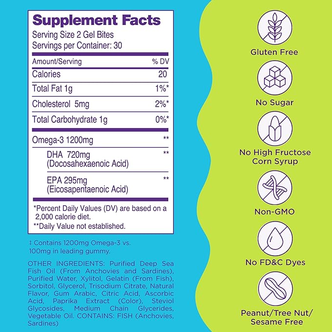 - 10x More Omega-3 Fatty Acids EPA & DHA: Our gel bites have the great taste you'd expect from a gummy, but contain 1,200mg of Omega-3s while the leading gummy only contains 100mg