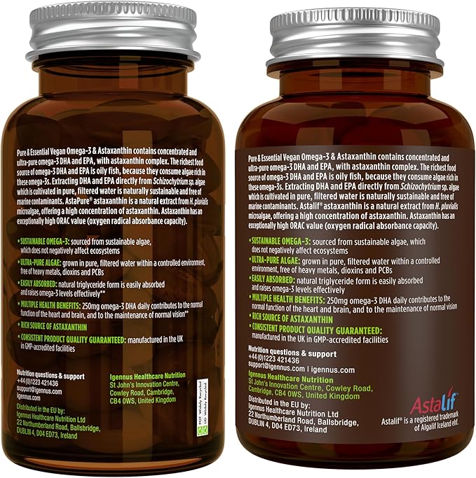 Vegan Omega-3 Natural Triglyceride Algae Oil, DHA & EPA Fatty Acid Supplement, 180 Small Softgels with Astaxanthin, Easy-to-Swallow, Pure & Sustainable, 90 Servings, by Igennus