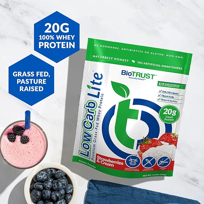 BioTrust Low Carb Lite, 20 Grams of Grass-Fed Whey Protein Isolate, 100 Calories, ProHydrolase Digestive Enzymes, Non-GMO, Free from Soy and Gluten, rBGH-Free (14 Servings) (Strawberries and Cream)
