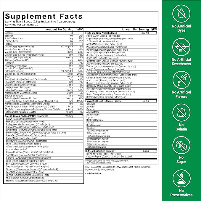 - PACKED WITH 37 FRUITS, VEGETABLES, & SUPERFOODS: Experience better energy and vitality with essential vitamins, and minerals from 40+ superfood ingredients like kale, broccoli, spinach, wheatgrass, berries, turmeric, and more.