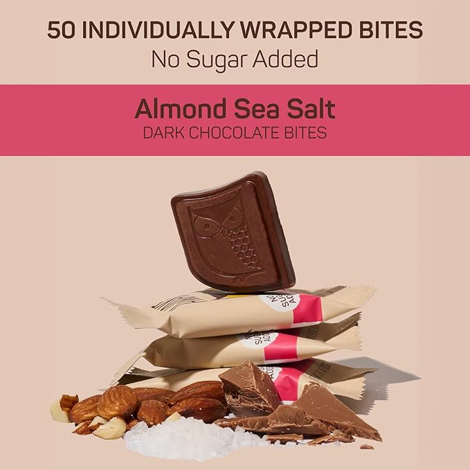 - NSA Almond Sea Salt Bites - Put a pep in your step without the sugar with a mix of our beloved Almond Sea Salt Bites! No sugar added dark chocolate with almond chunks and sea salt flakes. 50 individually wrapped bites with premium fairtrade chocolate.