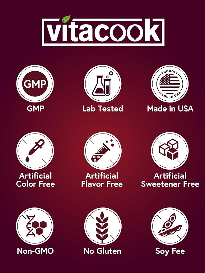 - Pure & Exceptional Products: Our supplements are made with pure, plant-based ingredients and backed by intensive scientific research to support your energy, health, and well-being.* They are non-GMO and do not contain gluten, dairy, soy, artificial colors, and preservatives. All Vitacook products are lab tested for purity and quality and made in USA in a GMP-audited facility.