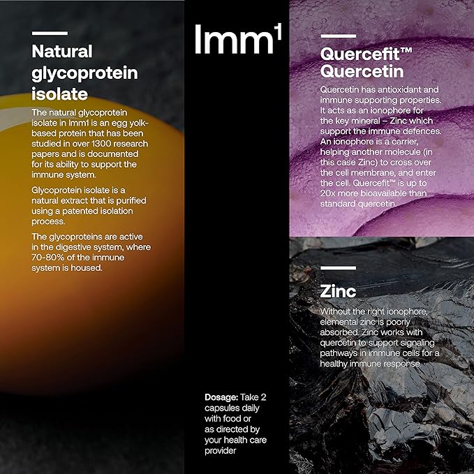 - UNIQUE BLEND: Imm¹ contains ingredients from the forefront of scientific research, including egg-yolk derived Muno-IgY (Natural Glycoprotein Isolate), Zinc, and Quercefit, a more bioavailable type of Quercetin that assists Zinc to enter the cells.