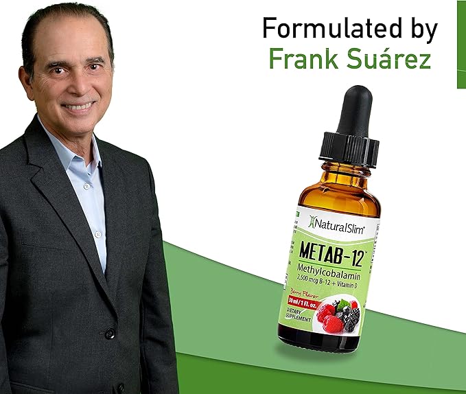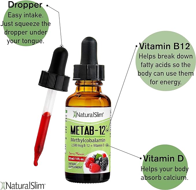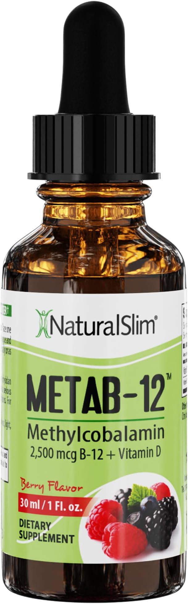 NaturalSlim Metab-12 - Liquid Vitamin B12 Sublingual Supplement 2500 mcg with Vitamin D3 Oral Drops - Methylcobalamin B12 for Metabolism & Energy Booster - Berry Flavor Gluten Free - 1 fl oz