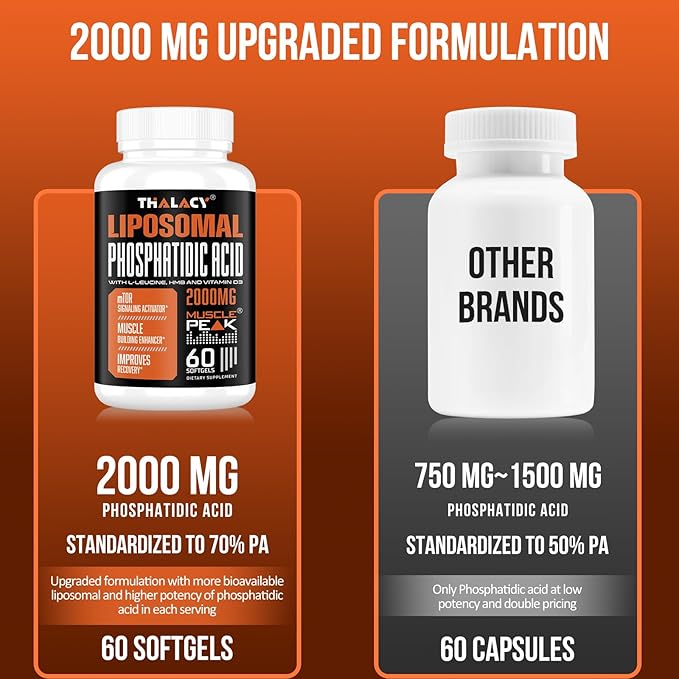 - 10X Liposomal Technology Maximize Bioavailability : Thalacy provides a well-developed liposomal technology ensuring optimal delivery of Phosphatidic Acid within your body. Maximizing the chance of achieving the intended absorption for Phosphatidic Acid, L-Leucine, HMB, and vitamin D3, which promise 10x more absorption rate and bioavailability than typical muscle building supplements