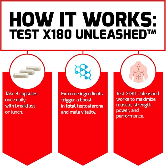 - BOOST TOTAL TESTOSTERONE: Test X180 Unleashed testosterone booster for men is scientifically formulated with ingredients that can help your body harness both free and bound testosterone so you can maximize your muscle-building potential.
