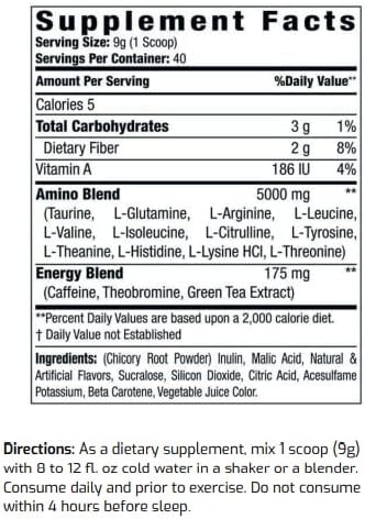 - INCREASES FOCUS AND INTENSITY with 5 grams of amino acids per serving