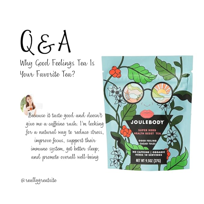 - Organic Tulsi Herbal Tea: JOULEBODY 5 PM Good Feeling Tea combines the power of Holy Basil (Tulsi) with cacao and Ashwagandha for a refreshing, stress-relieving post-workout blend.
