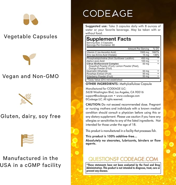 - Multi Sources of Vitamin C: Codeage Liposomal Vitamin C + is everything a modern vitamin C should be. One, it’s a high dose of 1,500mg vitamin C. Two, it offers a high amount of zinc. Three, it has wonderful citrus bioflavonoids with grapefruit, lemon, and orange powders. Four, it features elderberry powder. Five, it contains quercetin. Six, it provides rosehips extracts. Last but not least, it comes in a vitamin C liposomal delivery format. 2 months supply.*