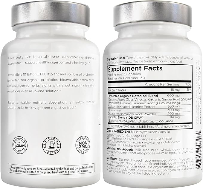 - Comprehensive Formula with Key Ingredients: Amen Leaky Gut+ supplement combines L-Glutamine, zinc, organic turmeric, licorice root, and marshmallow root in convenient-to-use capsules.