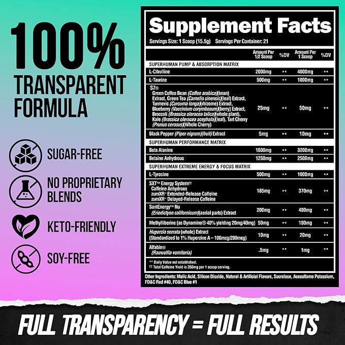 - GREAT TASTING CAFFEINE MATRIX: Our Extreme Workout Supplement provides increased total caffeine content powered by our all new SXT Sustained Energy and Focus System. This tri-source caffeine matrix will provide you with more sustained energy and focus vs the standard forms of caffeine used in other dietary supplements. Our Grapezilla Supplement will be like enjoying a delicious, top-shelf cocktail drink from a professional mixologist vs taking nasty shots of clearance bin vodka.