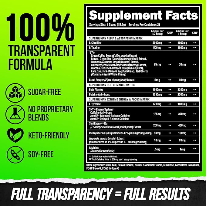 - GREAT TASTING CAFFEINE MATRIX: Our Superhuman Extreme Workout Supplement provides increased total caffeine content powered by our all new SXT Sustained Energy and Focus System. This tri-source caffeine matrix will provide you with more sustained energy and focus vs the standard forms of caffeine used in other dietary supplements. Our Hulk Juice Supplement will be like enjoying a delicious, top-shelf cocktail drink from a professional mixologist vs taking nasty shots of clearance bin vodka.