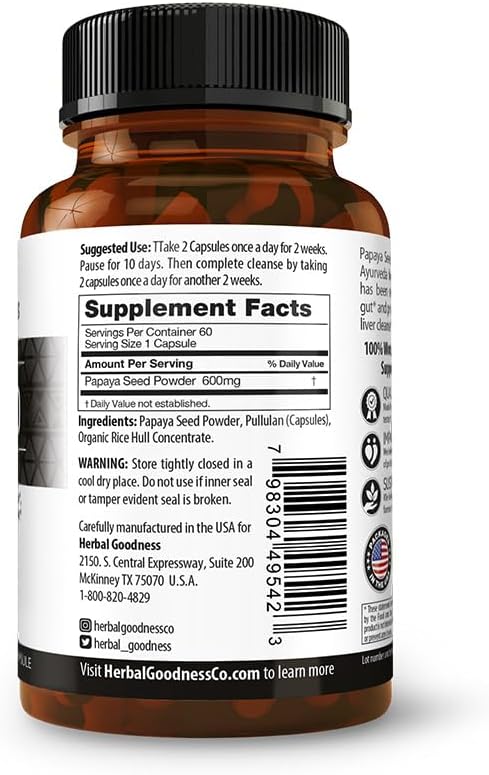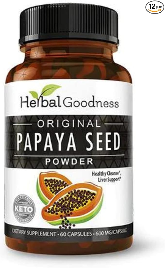 Herbal Goodness Papaya Seeds Capsules 60ct - Provides Health Support for Your Gut and Digestive System- 100% Natural Detox Cleanse for Humans - Body Detox and Colon Broom Formula - 12 Bottles