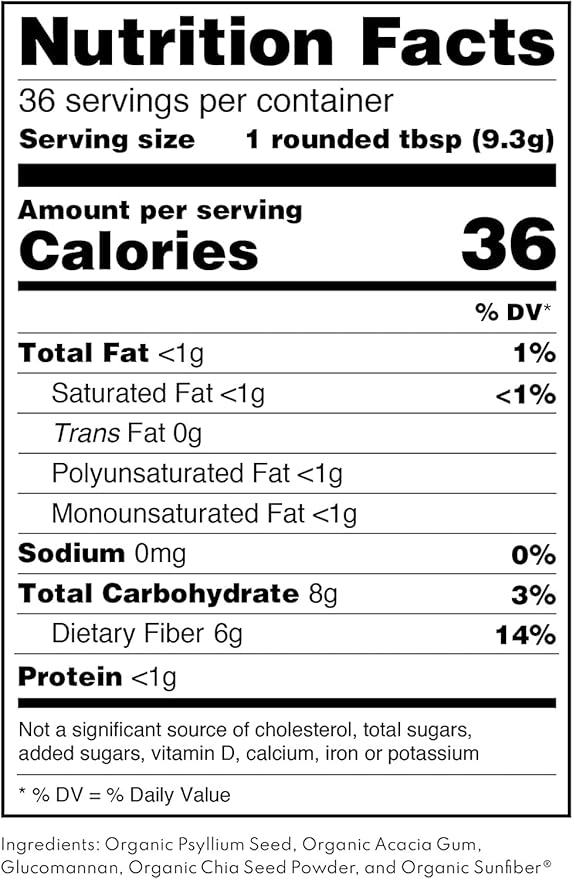 - ORGANIC INGREDIENTS: Organic Psyllium Seed, Organic Acacia Gum, Organic Chia Seed Powder, Glucomannan, and Organic Sunfiber