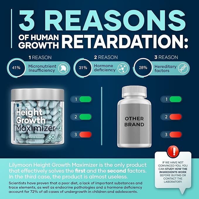 - Grow Tall Naturally - The World's famous scientists state that the main reason for growth speed reduction is a lack of vital nutrients like Vitamin D, Calcium, Spinach, Creatine, Zinc, L-Ornithine & l-Glutamine. Lilymoon growth pills for teens have them all and even more. With a daily intake, your kid will reach height potential in the shortest time possible.