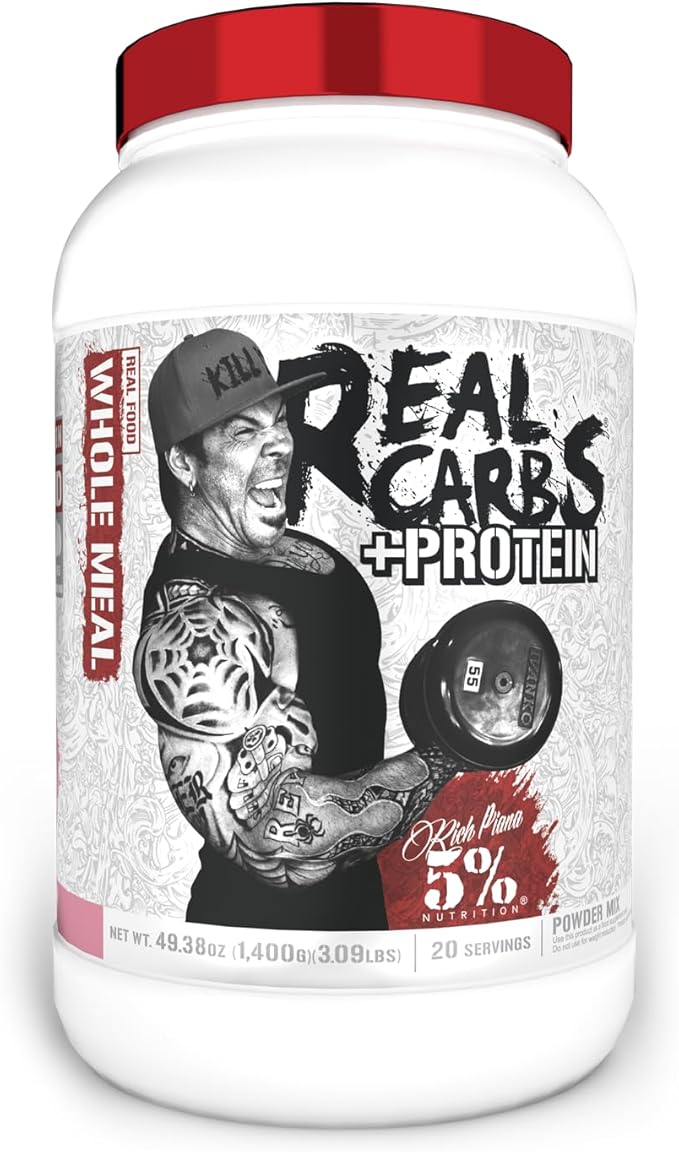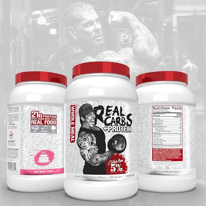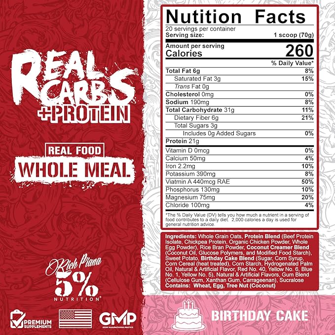 5% Nutrition Rich Piana Real Carbs + Protein | Clean Mass Gainer Protein Powder | Real Food Carbohydrate Fuel for Pre Workout/Post-Workout Recovery Meal | 3 lb, 20 Srvgs (Birthday Cake + Protein)