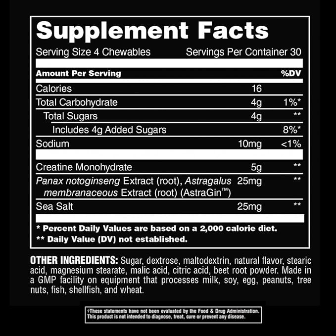 - The Power of Creatine in a Chew: Increase strength, boost endurance, improve workout performance, delay fatigue and promote mass gainer muscle growth cellular energy with this next level muscle pump supplement, four chews provide 5g of Creatine