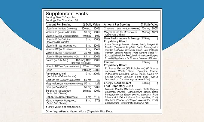 - Active Ingredients : Vitamin A, Vitamin C, Vitamin D3, Vitamin E, Vitamin B1, Vitamin B2, Vitamin B3, Vitamin B6, Folate, Vitamin B12, Biotin, Pantothenic Acid, Calcium, Magnesium, Zinc, Selenium, Copper, Manganese, Chromium, Molybdenum, Asian Ginseng, Tongkat Ali, Ashwagandha, Saw Palmetto, Stinging Nettle, Lutein, Boron, Echinacea, Spirulina, Garlic Extract, Beta - 1,3/1,6 Glucan, Turmeric, Cinnamon, Pomegranate, Bilberry, Hawthorn, Black Currant. Vitamin A, Vitamin C, Vitamin D3, Vitamin E, Vitamin B1, Vitamin B2, Vitamin B3, Vitamin B6, Folate, Vitamin B12, Biotin, Pantothenic Acid, Calcium, Magnesium, Zinc, Sele… See more
