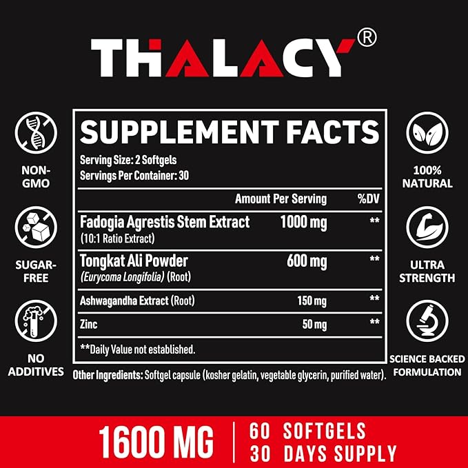 - Thalacy 1000 mg of Fadogia Agrestis (10:1 Extract) and 600 mg of Tongkat Ali, blend with 150 mg of Ashwagandha triple effect for maximum strength and performance