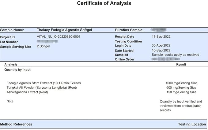 - Do not settle for Fadogia Agrestis extract supplements that only contain 300 mg, 500 mg, or 600 mg per serving, or the products blend with lower Tongkat Ali extract at only 50 mg~400 mg at a higher expense. Thalacy formula is a superior Fadogia Agrestis supplement option for you