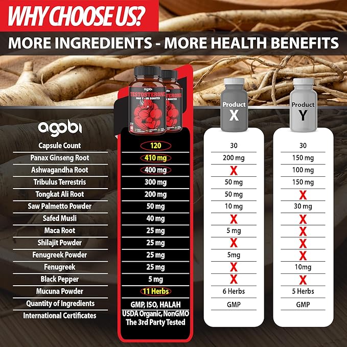 - ✅ Superior Strength: Agobi capsules equivalent to 14000 mg per Serving Size of all ingredients. Specially, our Ginseng, Ashwagandha, Tribulus are 10:1 Concentrated, more than 5:1 from others. Support always "On" status.