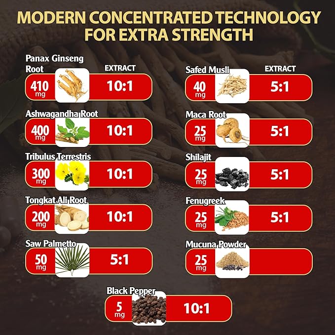 - ✅ 11-in-1 Special Formula with Panax Ginseng Root, Ashwagandha Root, Tribulus Terrestris, Tongkat Ali Root, Saw Palmetto, Safed Musli, Maca Root, Shilajit, Fenugreek, Black Pepper, Mucuna Powder; Elevating well-being.