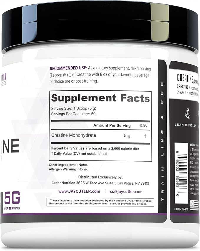 - Premium Creatine Monohydrate Formula: Developed by 4-time Mr. Olympia, Jay Cutler, Cutler Nutrition's Creatine Monohydrate delivers 5g of pure, high-quality creatine per serving to support muscle growth, enhance strength, and boost athletic performance.
