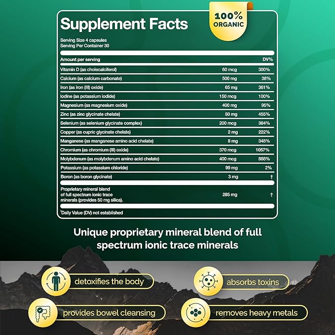 - 100% Organic: Our mineral supplements for women and men are Non-GMO and vegan full spectrum mineral complex. Safe for any age! No allergens added, and no side effects reported during the study.