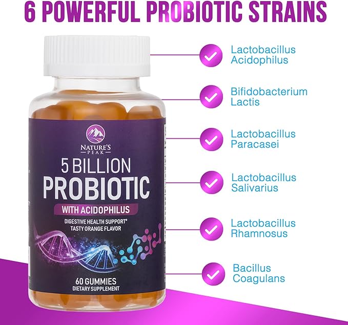 - Potent & Balanced: Each gummy of Nature’s Peak Acidophilus Probioticos serving packs a robust 5 billion CFU with 6 diverse strains, specially formulated probiotics for women and men digestive health