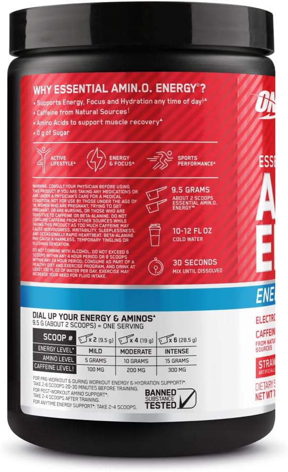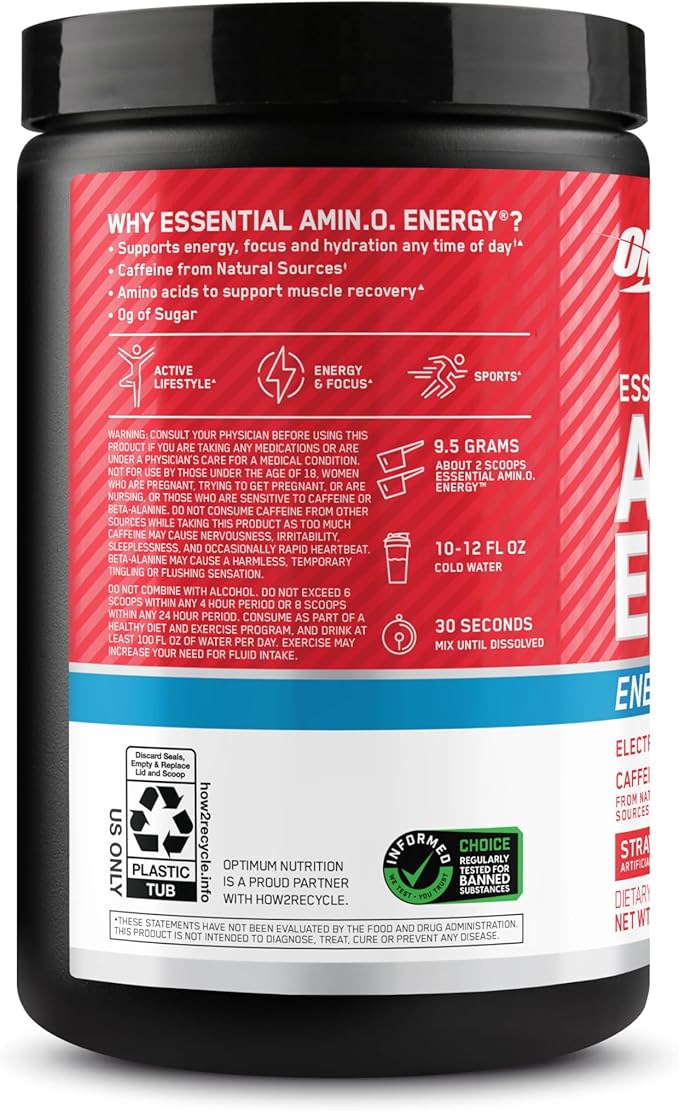 Optimum Nutrition Amino Energy Powder Plus Hydration, with BCAA, Electrolytes, and Caffeine, Strawberry Burst, 30 Servings (Packaging May Vary)