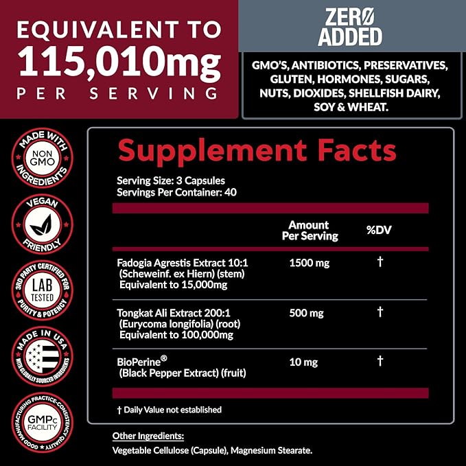 - Enhanced Absorption By 20X - Did you know regular Fadogia Agrestis has poor bio-availability and your body may only absorb 10% of the nutrients with minimal to no benefit? Our proprietary formula includes the most potent 10:1 Fadogia Agrestis + 200:1 Tongkat Ali & BioPerine [Equivalent to 115,000mg per serving] to ensure max nutrient bio-availability for peak performance & gains.