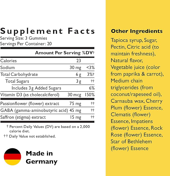 - KEY NUTRIENTS & BOTANICALS: Saffron, Passionflower, GABA, and Vitamin D