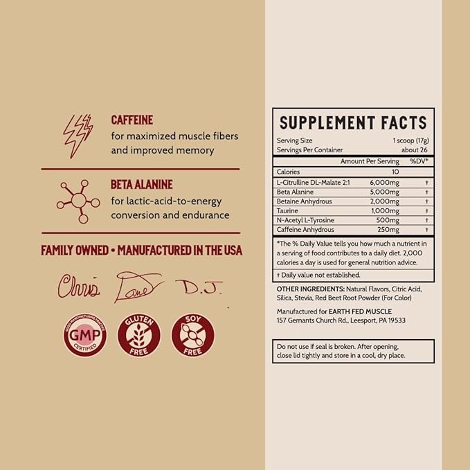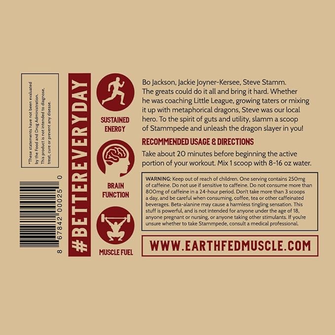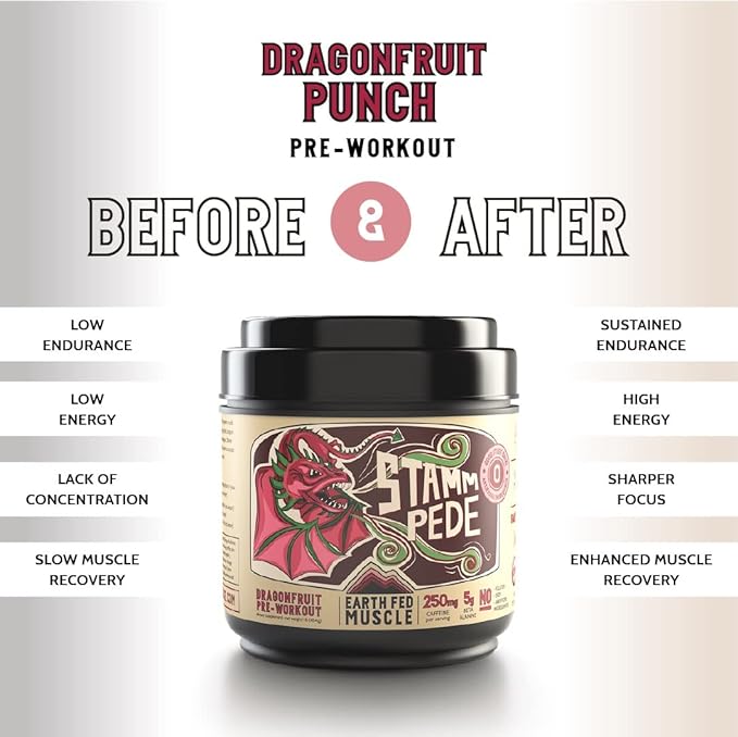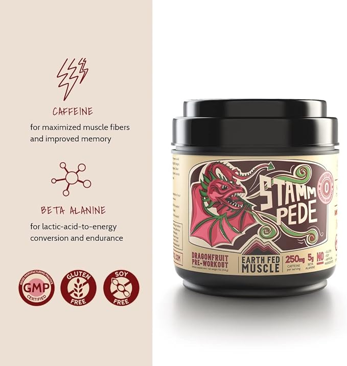 Earth Fed Muscle Stammpede DragoFruit Punch Pre Workout, 30 Servings, Boost Energy, Increase Endurance and Focus, Beta-Alanine, 250mg Caffeine, Citrulline Malate, Taurine, Tyrosine - Keto, No Sugar