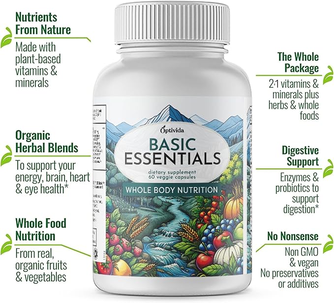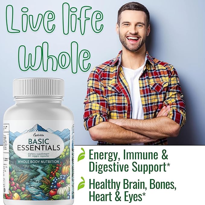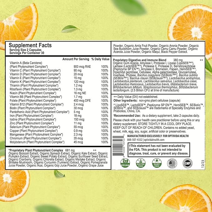 OPTIVIDA- Whole Food Multivitamin & Minerals All Natural Fruits & Vegetables | Probiotics, Prebiotics, and Postbiotics | Immune, Gut, Mind, Energy & More (60 Capsules)
