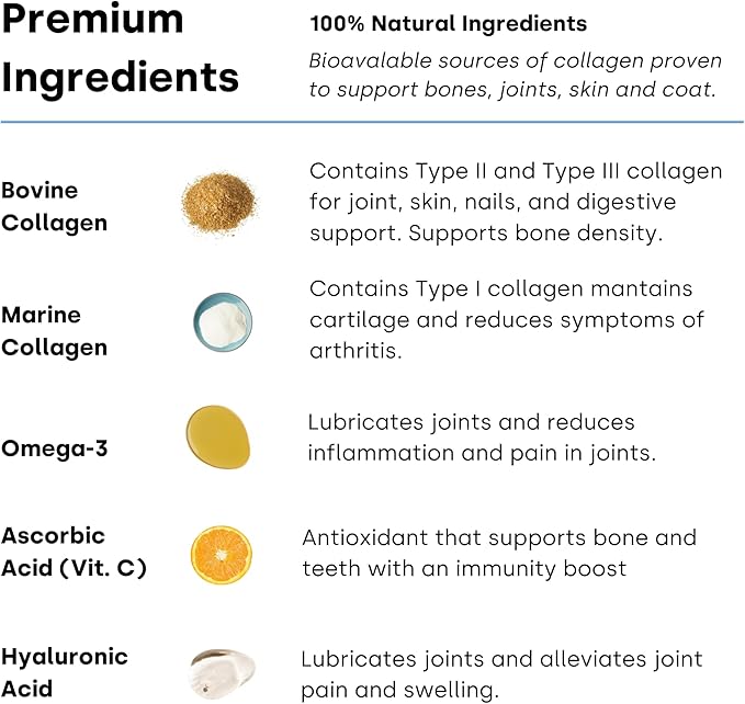 - Natural Ingredients That Work Together - Hyaluronic acid and Vitamin C are great nutrients to give your dog on their own, but they also help collagen work more efficiently for your dog.