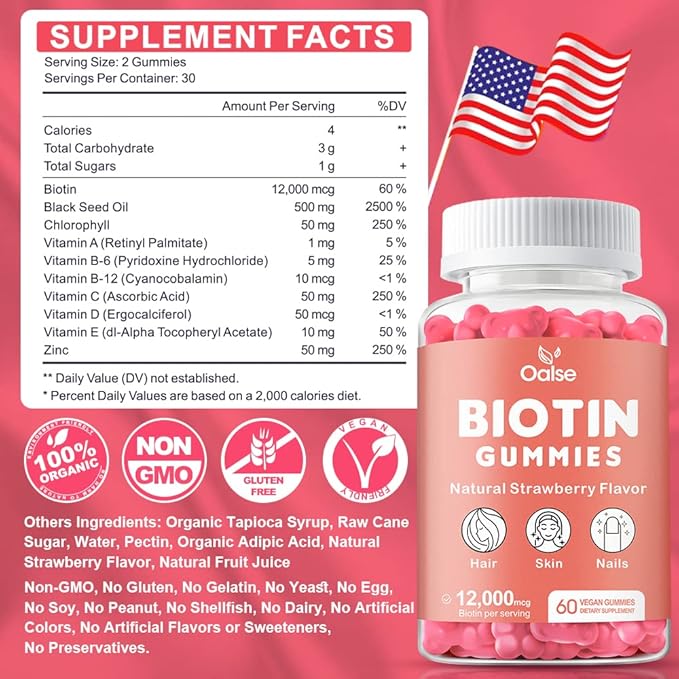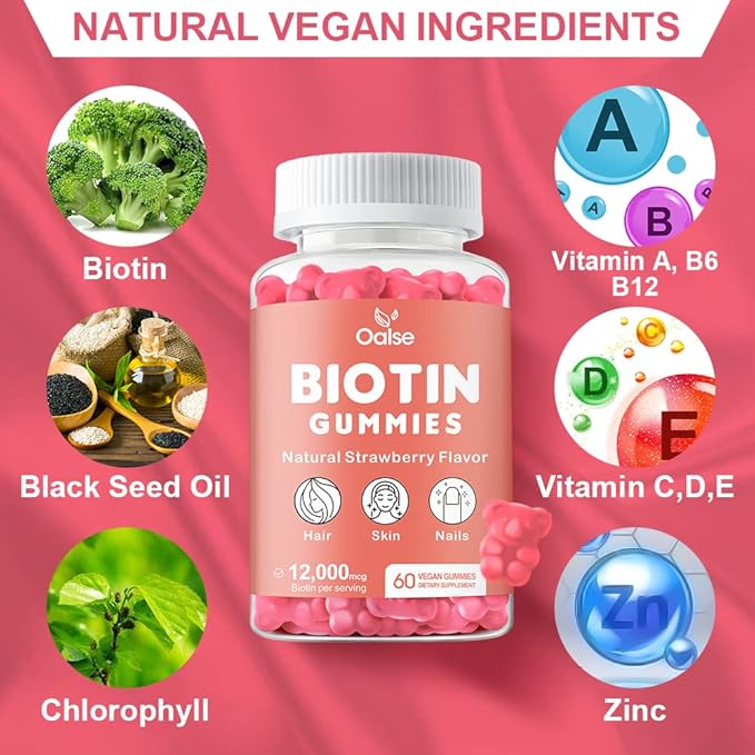 - ๐ 10-IN-1 Superfood Formula -- Biotin vitamins is beneficial for the growth of hair skin and nails. 12,000 mcg biotin for 2 gummies, which is really good! Chlorophyll, Black Seed Oil, Zinc, Vatimin A, B6, B12, C, D, E extra added. Suitable for anyone who is looking for an easy and green way to get a biotin supplement in their diet!