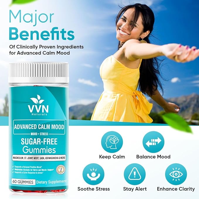 - Advanced Stress Support Formula - Try our new stress management gummies! Our mixed berries-flavored sugar-free gummies contain 22 key vitamins, minerals, and herbs that help promote a relaxed and happy mood for both men and women. Chew on two gummies daily to help stay calm even under stress. This advanced formula is a great alternative to ashwagandha capsules.