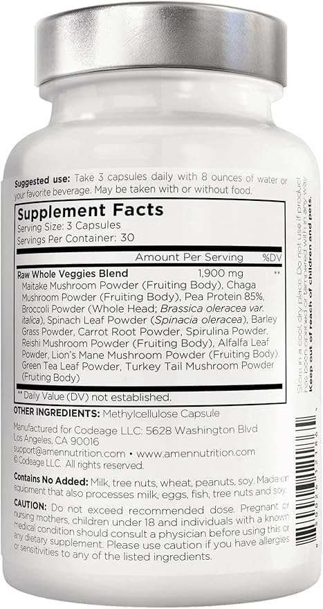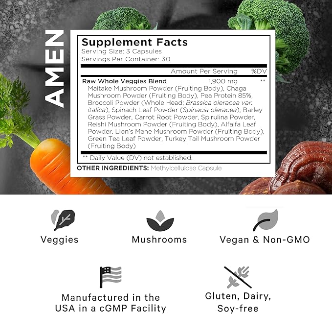 - Mushroom Complex: Sourced from raw food extracts, this Amen vegetables whole food supplement formula combines Maitake and Chaga mushroom powder with Reishi, Lion's Mane, and Turkey Tail mushroom extracts.
