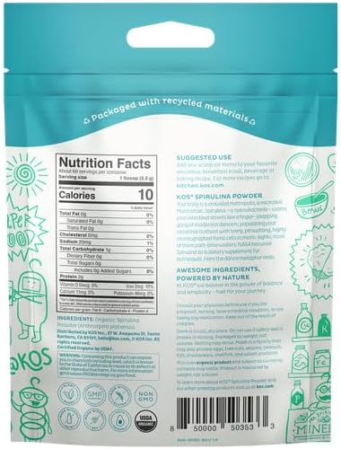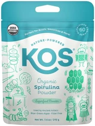 KOS USDA Organic Spirulina Powder, Natural Taste - 100% Pure, Non-Irradiated Vegan Green Blue Spirulina Superfood Powder, Plant Based - Rich in Protein, Vitamins, Antioxidants & Fiber, 60 Servings Bag