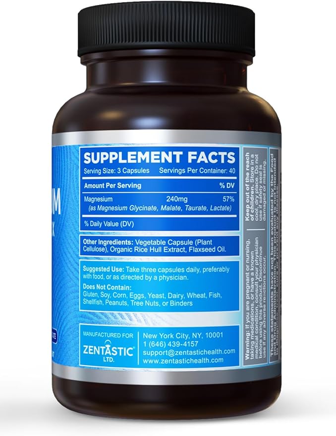 - 4-In-1 Blend Chelated Magnesium: Zentastic Magnesium Complex is a high absorption magnesium blend that features 240mg of elemental magnesium Glycinate, Malate, Taurate and Lactate for a wide range of benefits. There are equal amounts of each magnesium type. This blend is easy on the stomach since there's no magnesium citrate or less expensive forms like magnesium oxide.