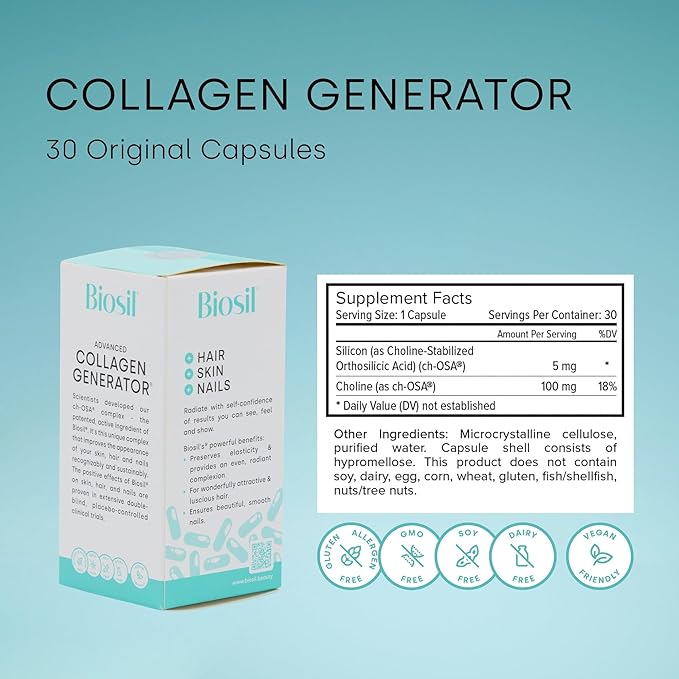 - ACTIVATE YOUR BEAUTY - The ch-OSA in Biosil Collagen Generator increases collagen, keratin, and elastin levels in your body. The result? Less wrinkles, glowing skin, luscious hair, and seriously strong nails.