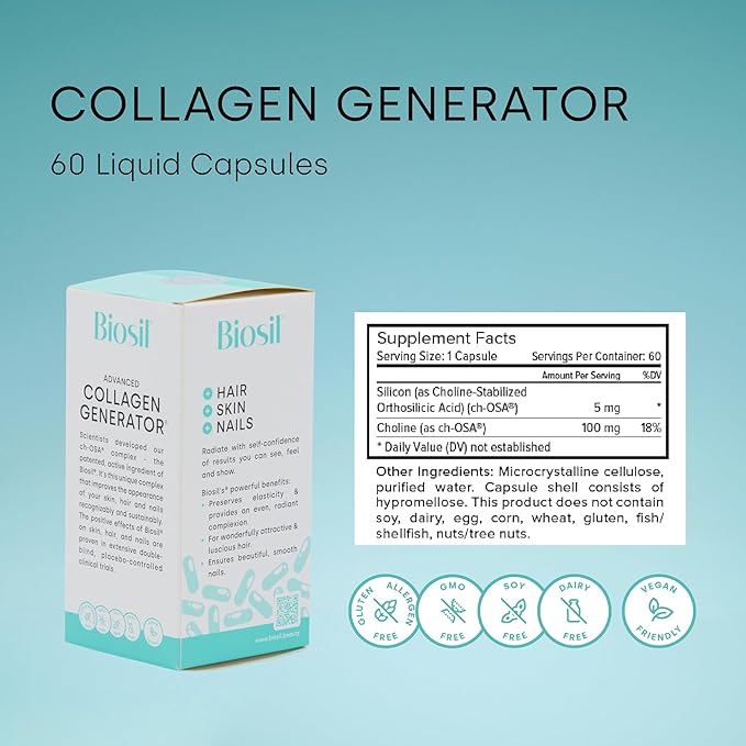 - ACTIVATE YOUR BEAUTY - The ch-OSA in Biosil Collagen Generator Liquid Capsules increases collagen, keratin, and elastin levels in your body. The result? Less wrinkles, glowing skin, luscious hair, and seriously strong nails.