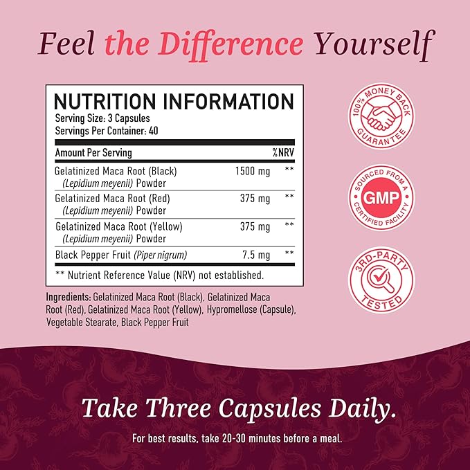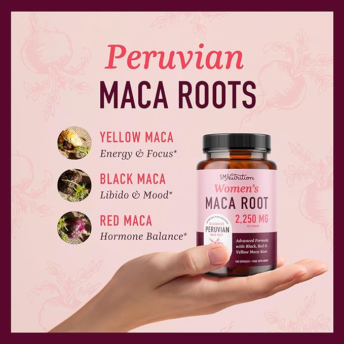 - OUR DIFFERENCE: Women's Maca Root by SMNutrition is Third-Party Tested, manufactured in a facility that is certified GMP compliant, and gelatinized for added potency compared to maca pills. Each serving of 3 Maca Root capsules provides 2250MG, and every bottle contains 40 servings.