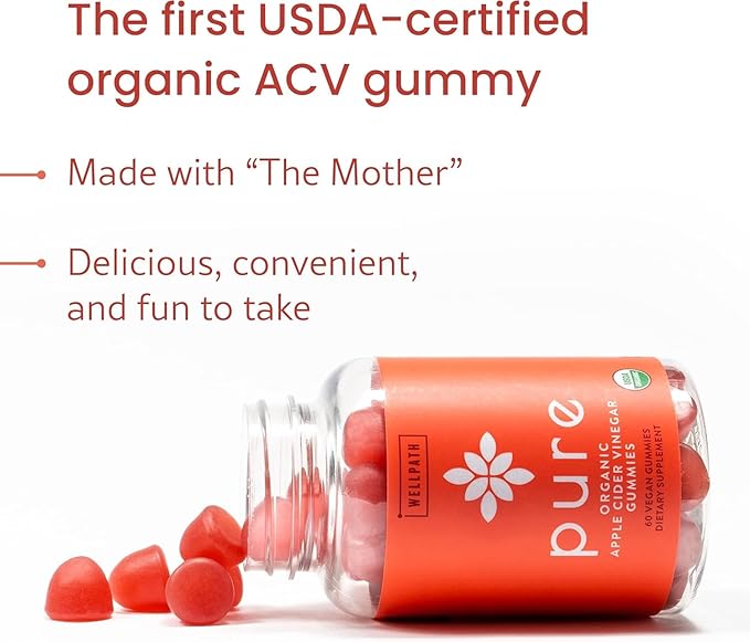 - [Organic Apple Cider Vinegar Gummies 2-Pack] Each bottle of Pure has 60 delicious USDA Organic apple cider vinegar gummies with "the mother.” Each serving has acetic acid that may help cleanse your body.