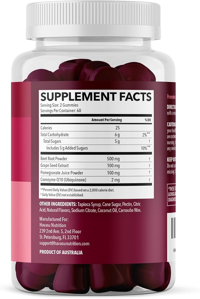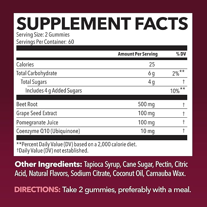 - Nitric Oxide Support - Our gummies are formulated with beet root and CoQ10 to support nitric oxide production, helping to elevate endurance and recovery during daily activities.