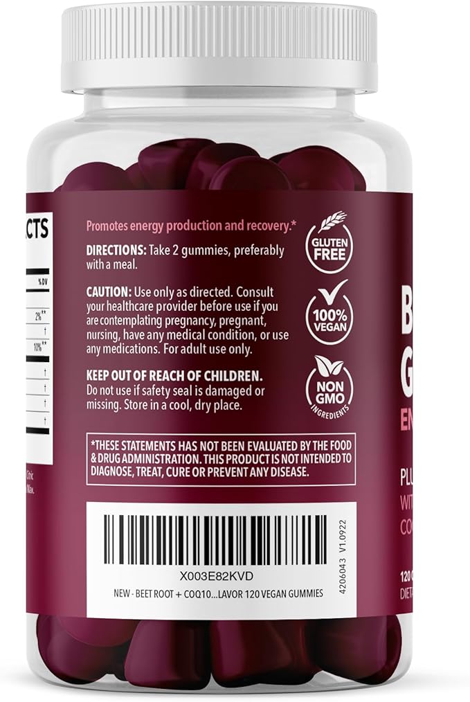 - Energy-Supporting Beet Root Gummies - Each gummy delivers 500mg beet root, supporting energy levels and endurance, ideal for men and women seeking a convenient performance support.