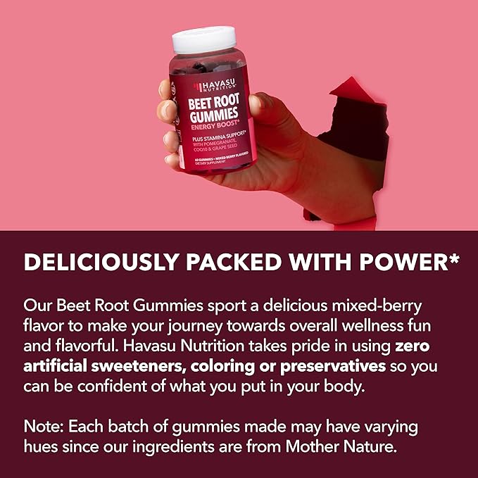 - Convenient & Flavorful - Enjoy the benefits of beet root in a delicious mixed berry gummy, offering an easy and tasty way to support energy and endurance without the need for beet juice or powder.