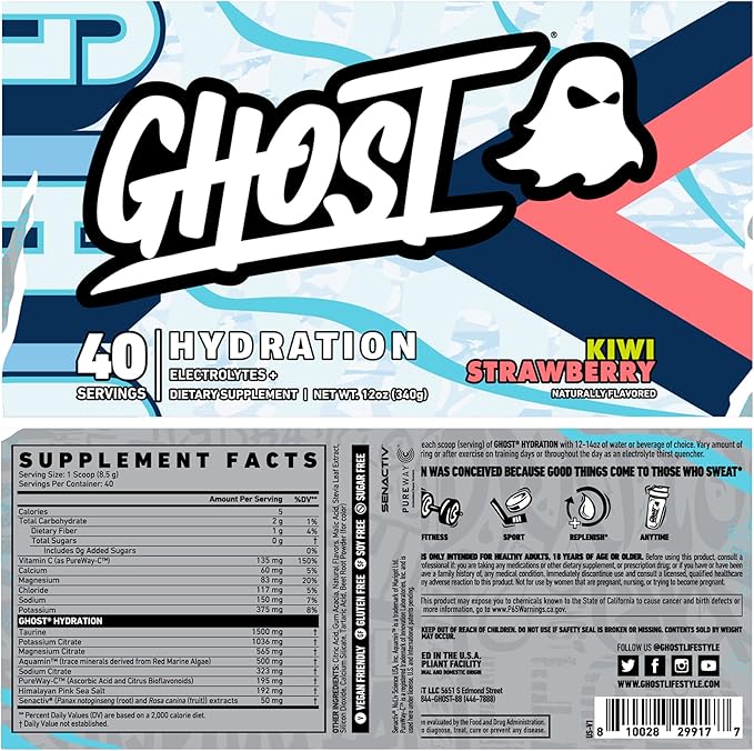 - Stay Hydrated: GHOST Hydration can be used anytime to elevate your water or replace sugary sports drinks. Grab a bottle of water (or your favorite GHOST shaker), toss in a scoop of GHOST Hydration, and enjoy some seriously epic-tasting, electrolyte-enhanced H2O while you hit the gym, the field, the ice, or even the office on a Monday. Kiwi Strawberry flavor. 1 scoop per serving, 40 servings per container.